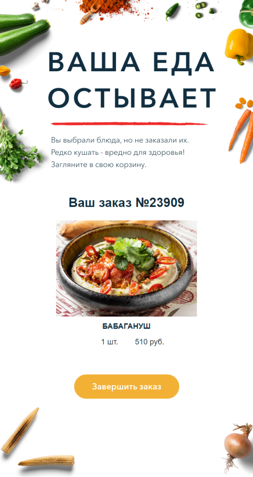 Наконец, еще один pop-up появляется, когда пользователь положил товары в корзину, но не оплатил их. Чтобы пользователь завершил заказ, мы предлагаем за подписку подарок к выбранным блюдам.