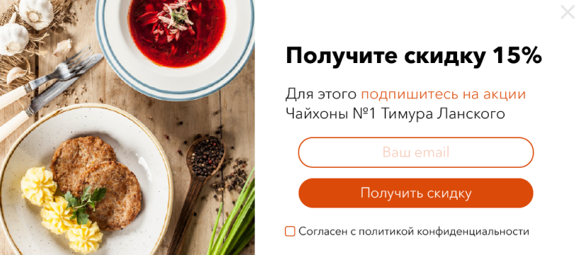 Остальные пользователи видят pop-up спустя минуту посещения сайта. За 60 секунд сайт покидают случайные пользователи, а те, кто заинтересовался меню или делает заказ, еще не успевают уйти. В этот момент мы предлагаем скидку на доставку, которая придет в email-письме.