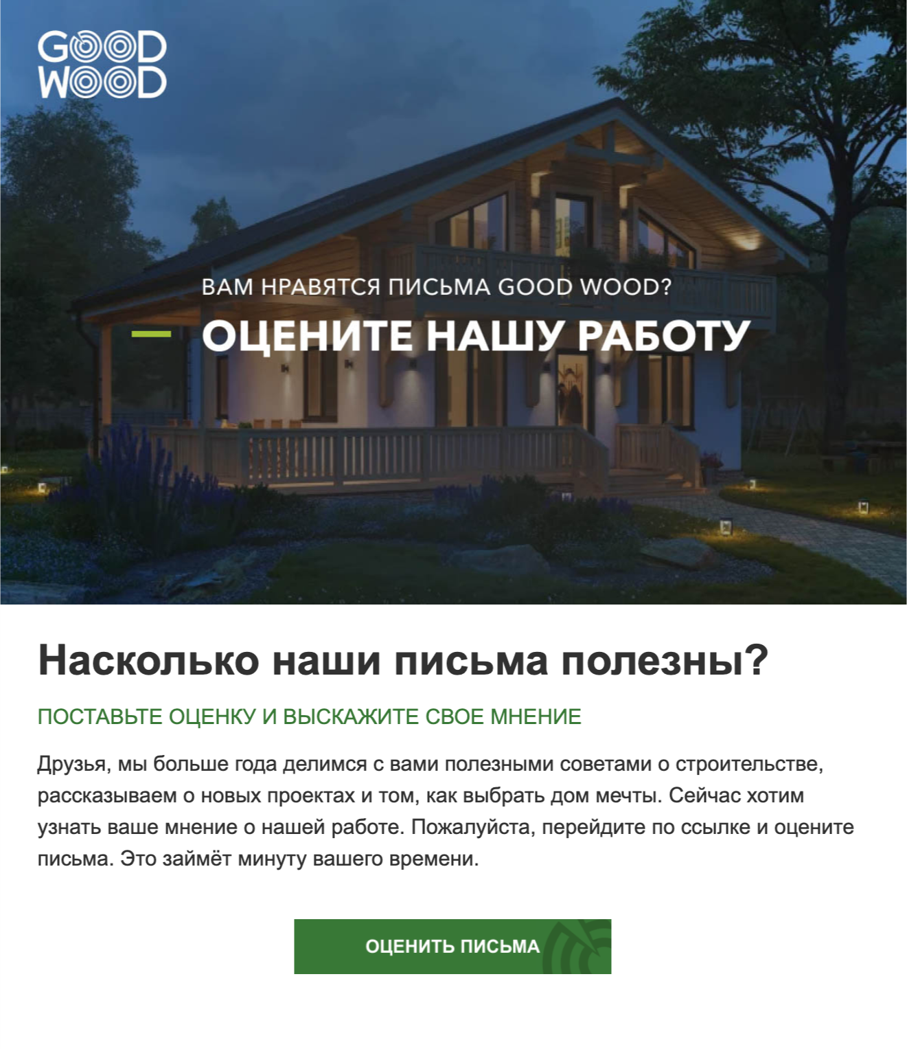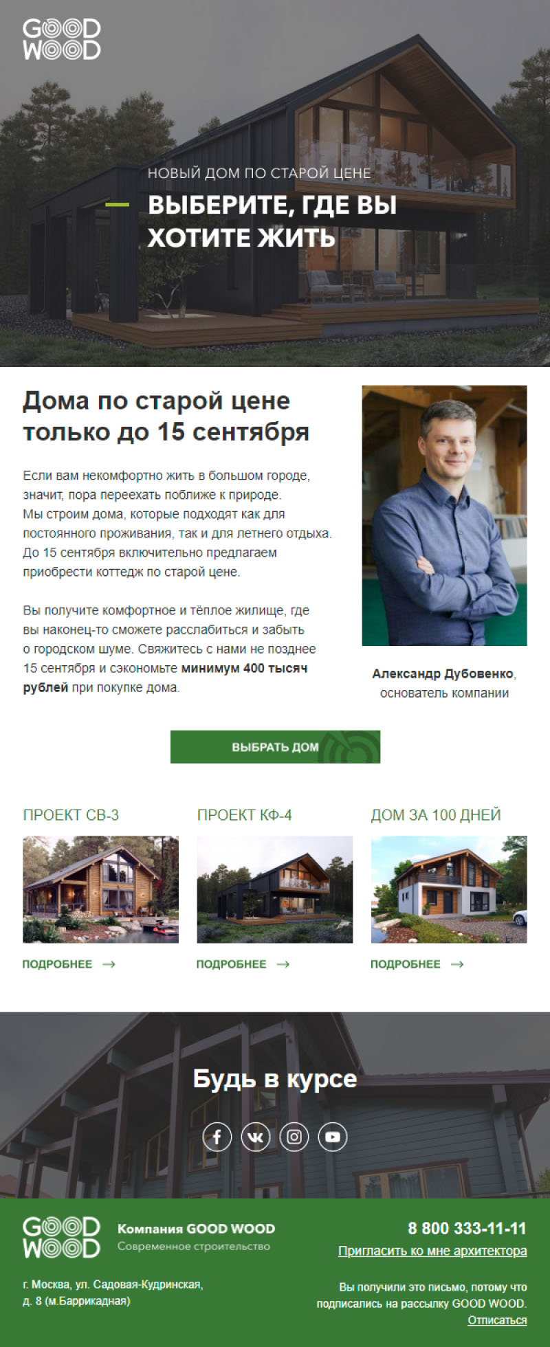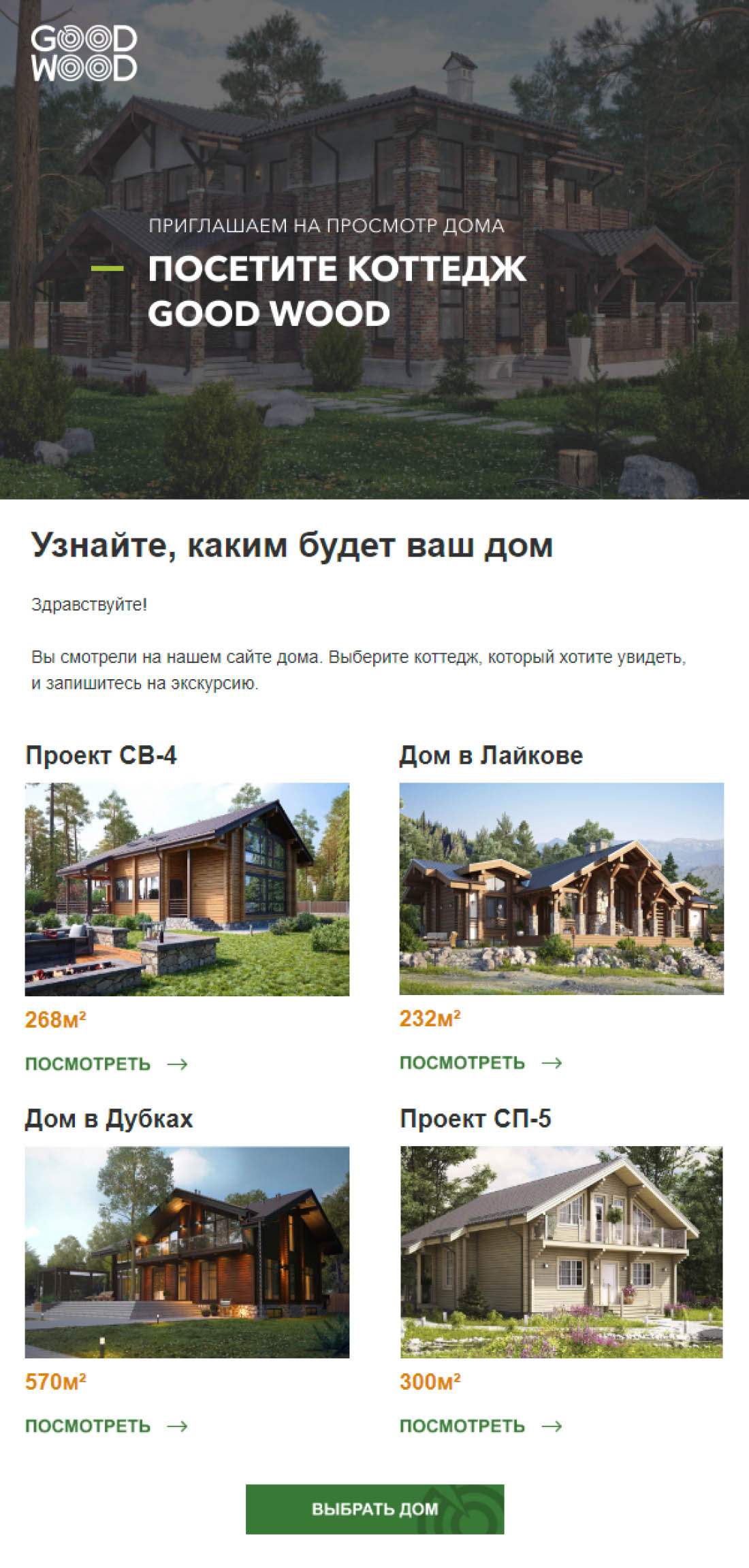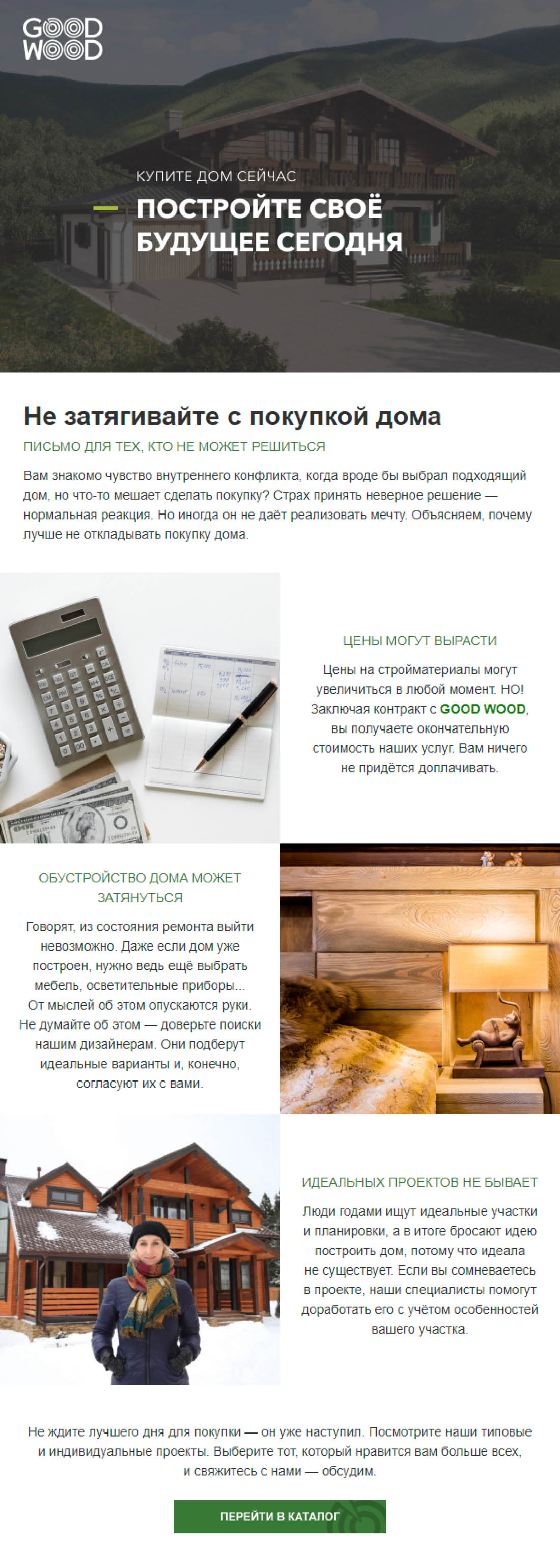 Для тех, кто связался с менеджерами, разработали дополнительные письма. Например, клиент общался с менеджером, но не решился на покупку дома. Подготовили триггерные сообщения для всех этапов воронки продаж: обратился в компанию, встреча назначена, оставил заявку, получил коммерческое предложение и т. д. Запустили письма, которые срабатывали на триггеры «Встреча состоялась» (в них убеждали, что не стоит тянуть с покупкой, потому что цены могут вырасти, а обустройство дома — затянуться) и «Принимают решение» (обосновали стоимость, объяснили, что работа действительно качественная).