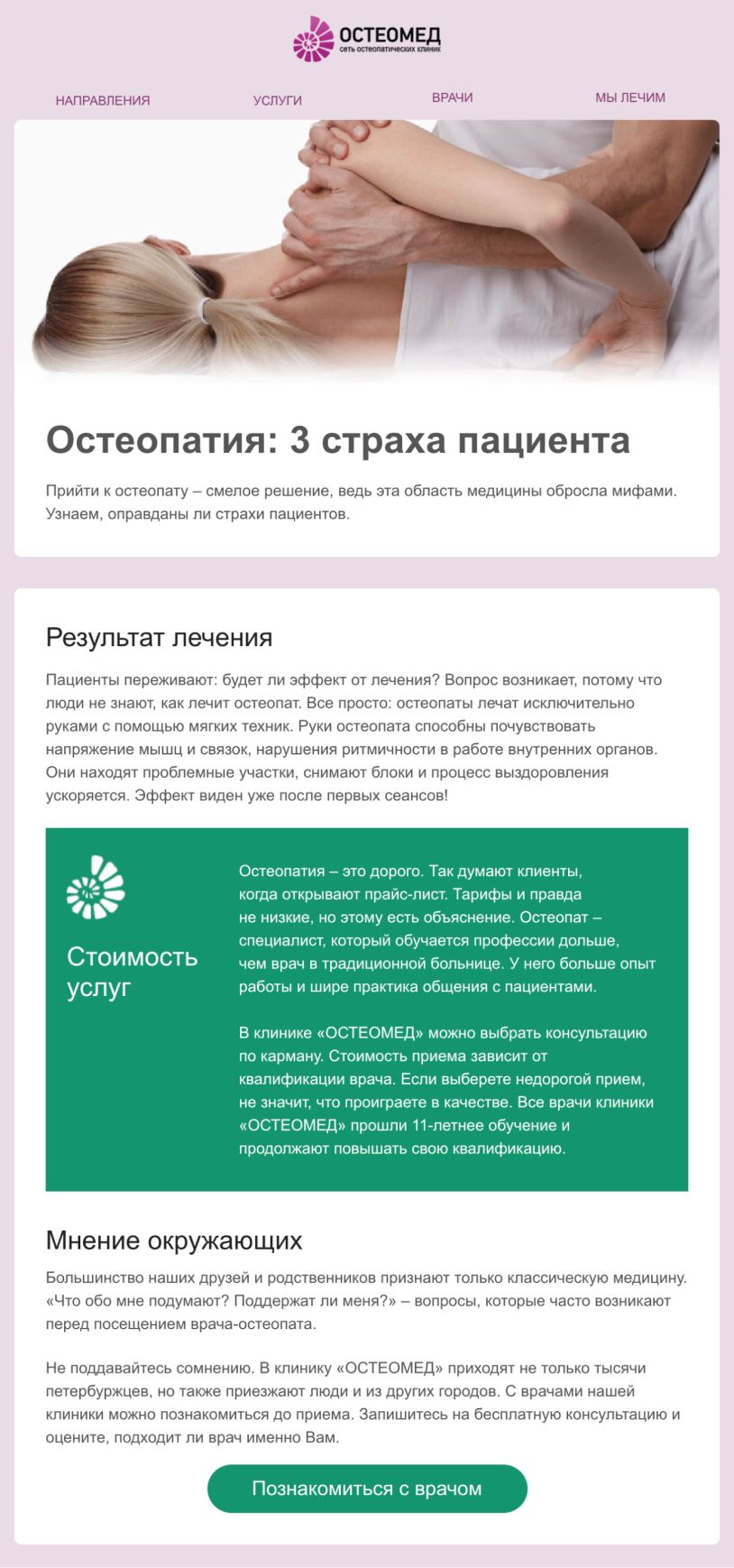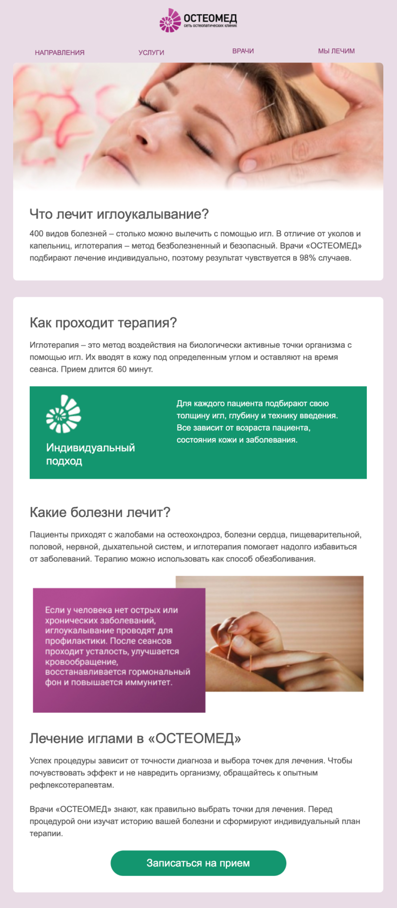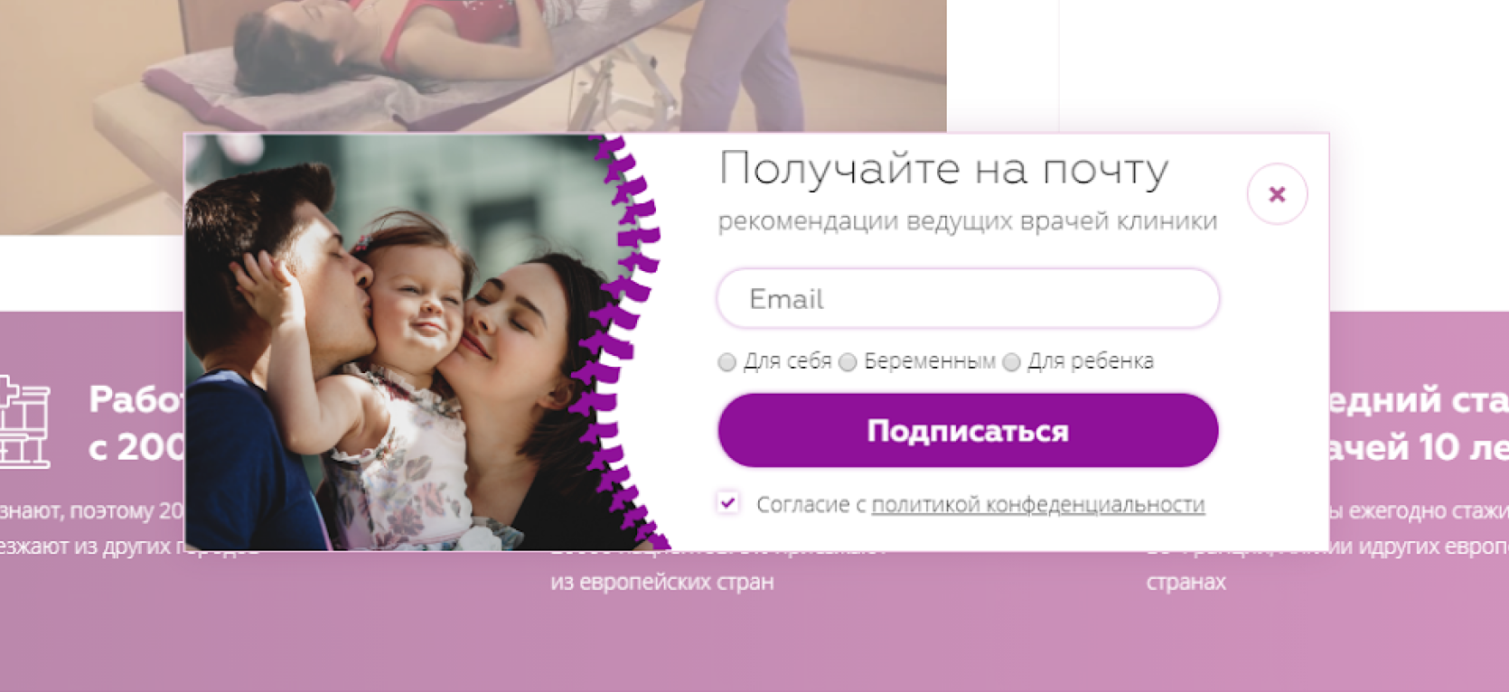 Изучили статистику о поведении пользователей на сайте, протестировали время появления поп-апа (1, 3 или 5 минут). В итоге выбрали оптимальное время отображения. За 5 минут пользователь успевал ознакомиться с услугами медцентра и был готов оставить email, чтобы получить письмо.