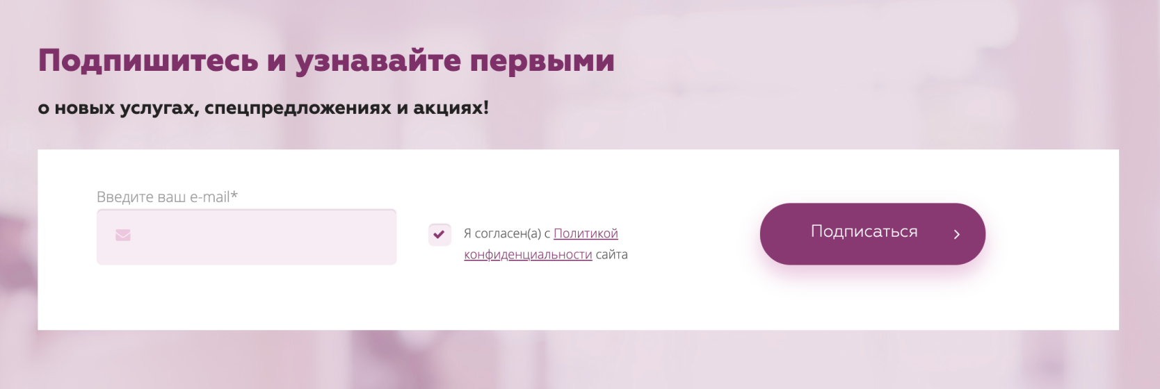 Статичную форму установили в нижней части сайта. Призывали подписаться, чтобы первым узнавать о спецпредложениях, новых услугах и акциях.