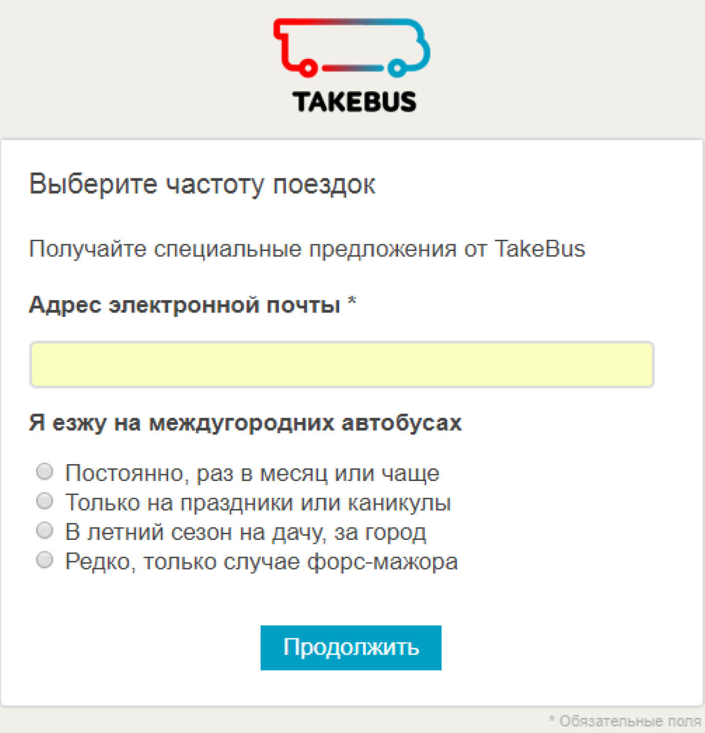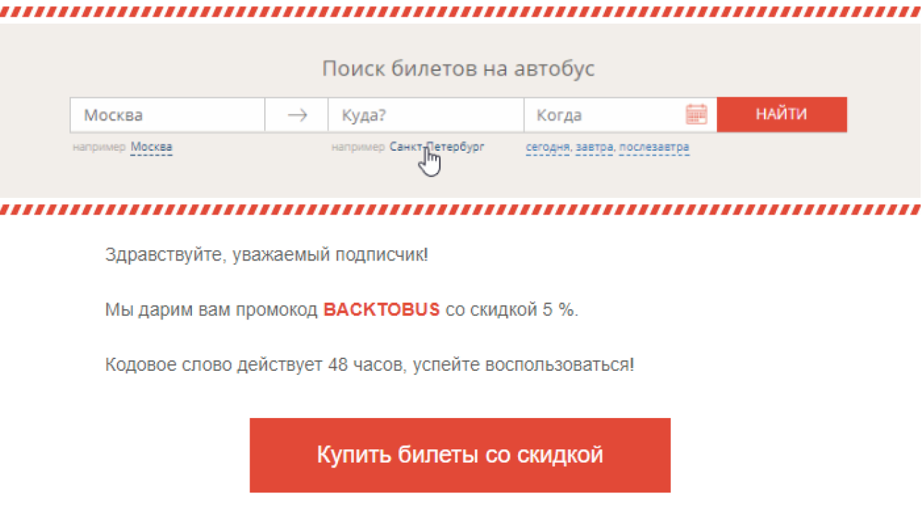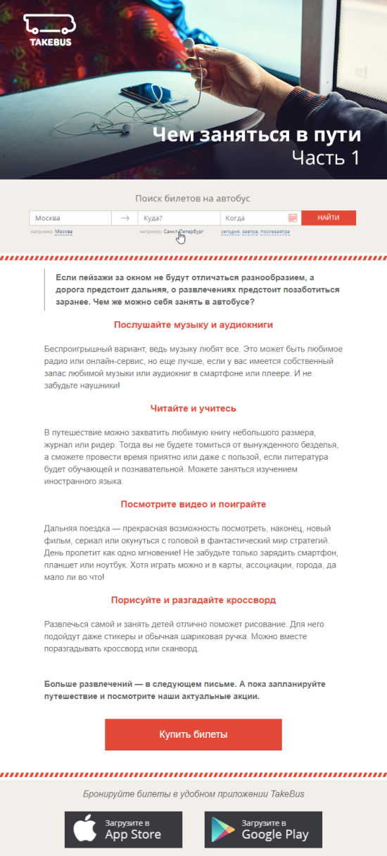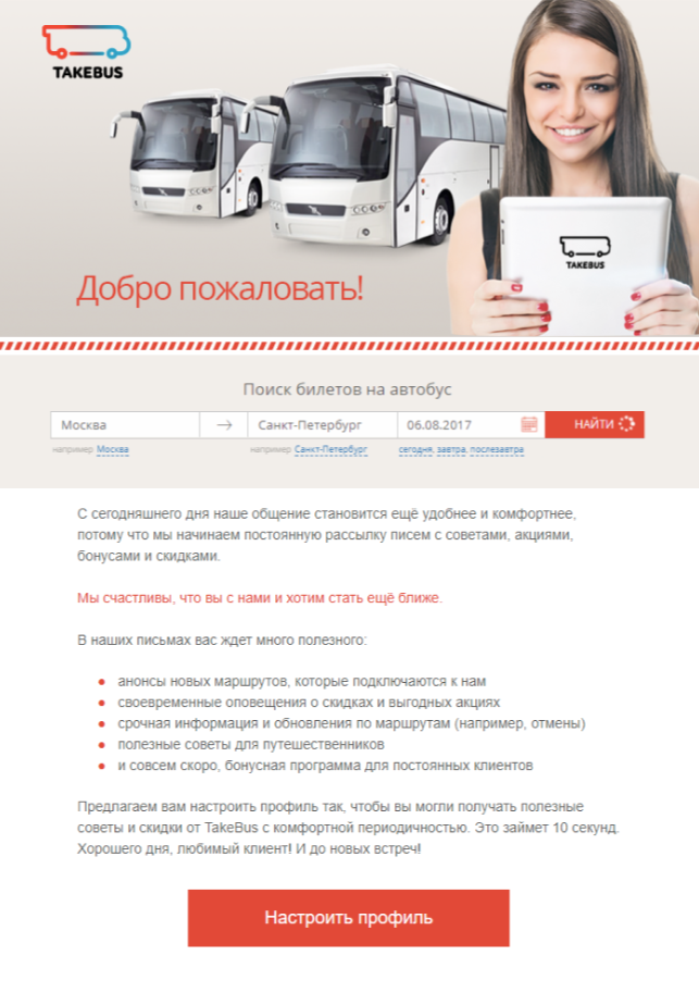 Так, тема первого письма звучала как «Дарим скидку 5% на поездку с Takebus», второго — «Пора в путь! Заберите скидку 5% на поездку с Takebus».