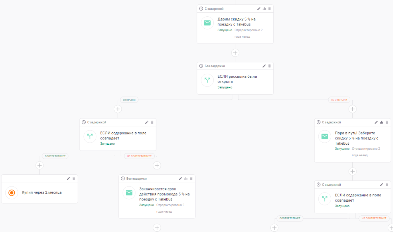Важно не только привлечь клиента, но и удержать его. Мы настроили письма для людей, не покупавших билетов 2 и 4 месяца. Таким пользователям автоматически отправлялось письмо с промокодом на скидку. Если его не открывали, уходило ещё одно сообщение с другой темой.