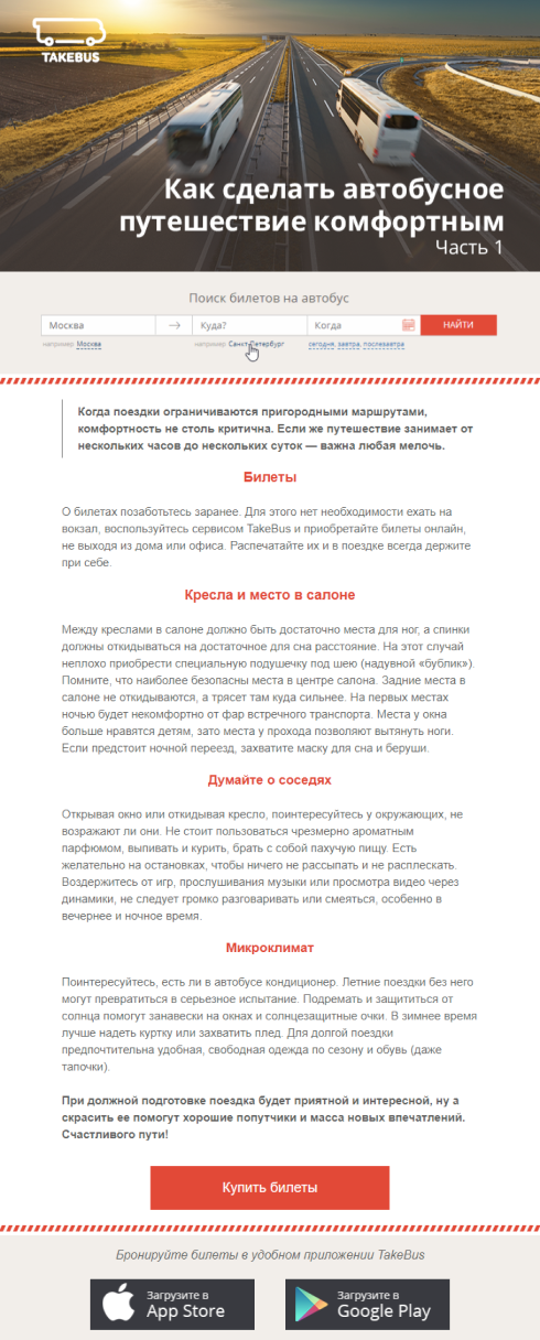 Хорошая рассылка приносит пользу. Мы ввели познавательные письма — они приходили подписчикам после welcome-серии с выбранной при сегментации периодичностью. В них рассказали о лайфхаках для тех, кто путешествует автобусом.